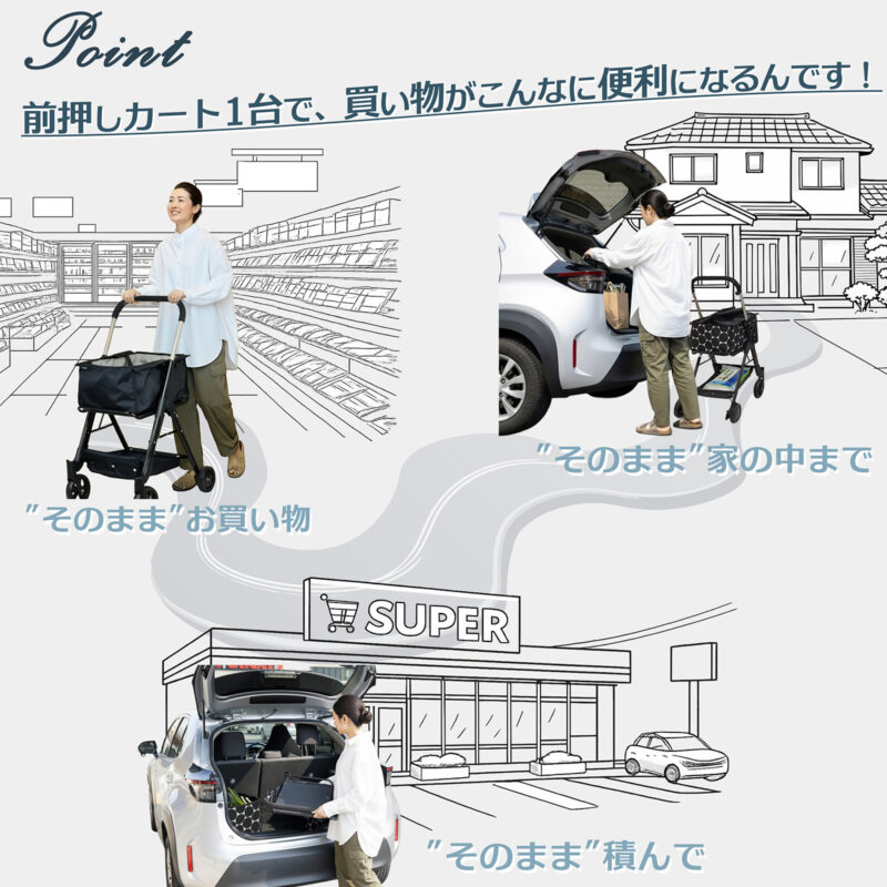 帰宅後も、車から玄関まで再びカートを使えるため、重たい荷物を何度も持ち替える必要がありません。家から車へ、店内へ、そして再び自宅まで。